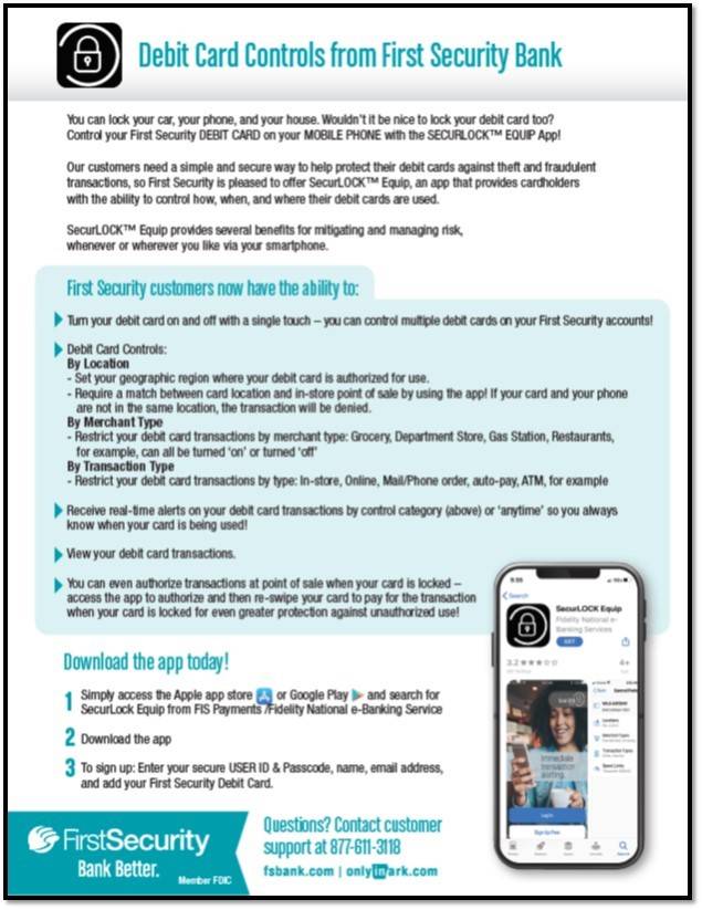 Download the SecurLOCK app to prevent theft and fraudulent transactions. Control your debit card by toggling access on or off by location, merchant type and transaction type. Receive real-time alerts for transactions anytime your card is used! Download the app to take control of your First Security debit card.